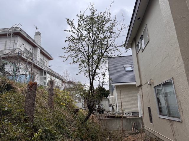 過去に2度、広い表のお庭にあるたくさんの庭木の剪定や、伐採をご依頼くださっていたリピーター様宅のご実家で、今回は裏庭にあります桜と雑木の伐採作業を行わせていただきました。